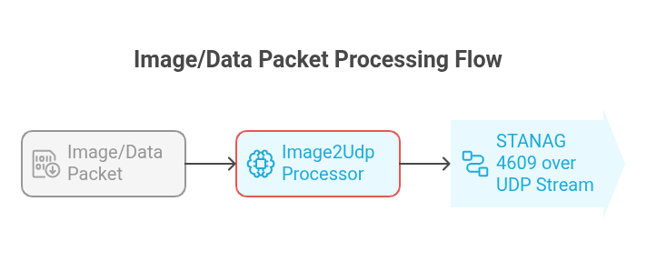 Image2Udp is a containerized processor that receives image frames and associated metadata as packets over a Unix Domain Socket. These packets include raw image data, presentation timestamps (PTS), and optional JSON-formatted metadata. Running inside a Docker container, Image2Udp encodes the image into H.264 video, multiplexes it with synchronized metadata, and outputs a STANAG 4609-compliant stream over UDP. This makes it ideal for systems requiring a low latency video and metadata transmission from external applications.